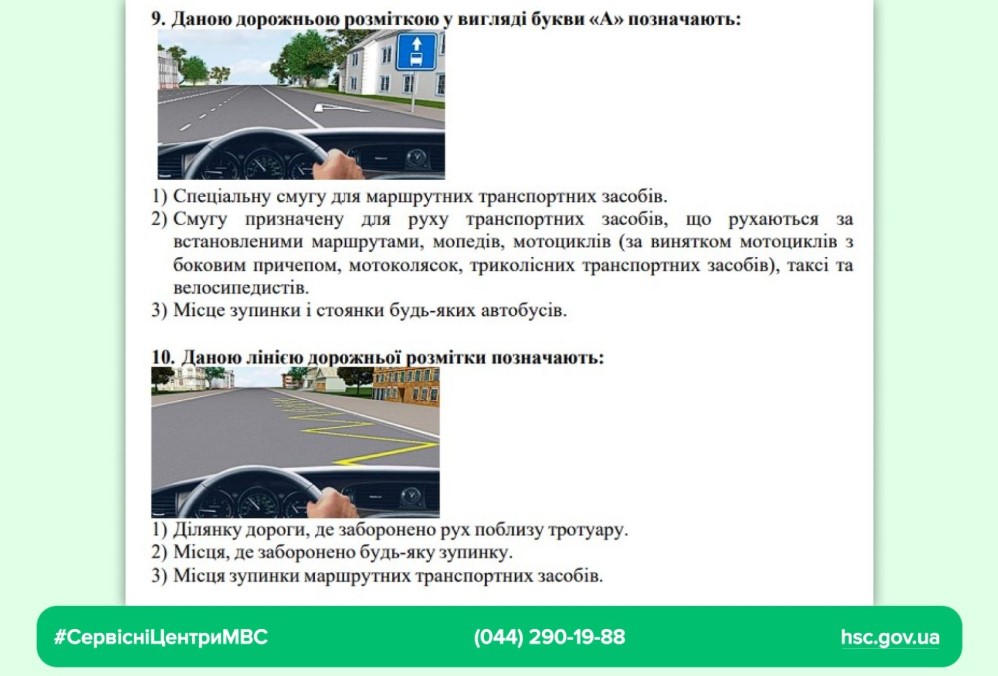 Дорожня розмітка: оновлені питання № 9, № 10 та № 13, які уточнюють застосування розмітки «А» та смуг руху для громадського транспорту.