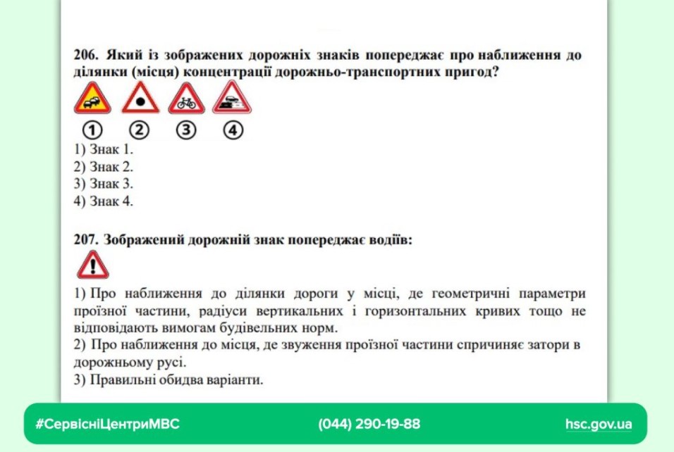 Дорожні знаки: змінено питання № 206 та № 207, щоб точніше пояснити значення знаків, що попереджають про небезпечні ділянки дороги.